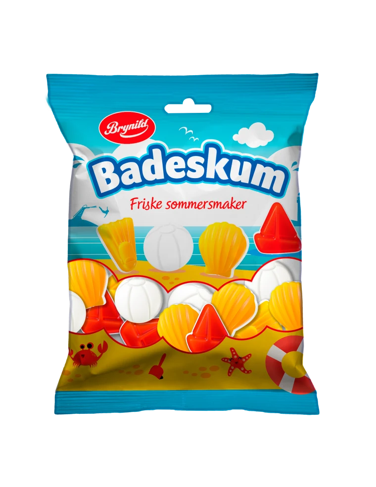Brynild Badeskum er en fruktig og lettspist mix som passer perfekt på stranden eller i piknik-kurven. Med sine friske smaker og sommerlige design er gjensynsgleden stor hvert år når det lir mot sommer og badetemperaturen stiger.
